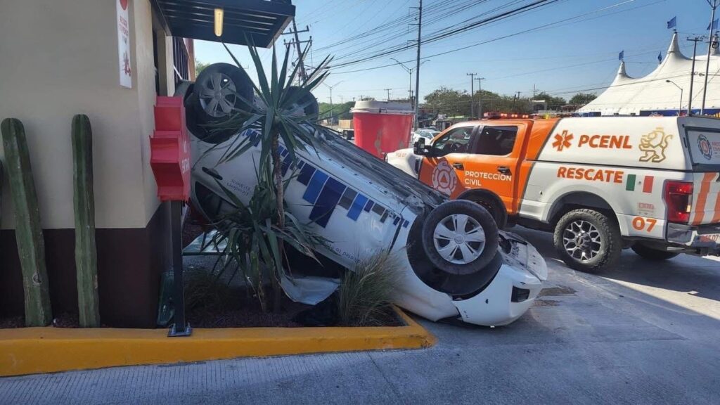 GUADALUPE, N.L. — Un automovilista perdió el control de su vehículo tras impactarse contra un taxi y posteriormente terminó volcado, proyectándose contra la fachada de un establecimiento comercial en el municipio.