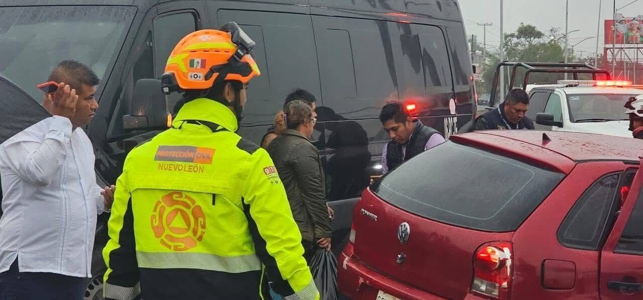 Tras la valoración correspondiente, las víctimas fueron trasladadas al Hospital General de Zona No. 21 del IMSS para recibir atención médica especializada. Autoridades descartaron riesgos adicionales en el área y la Policía de Apodaca tomó conocimiento del incidente. Uno de los carriles en sentido poniente–oriente permanece afectado. En el choque participaron un vehículo Pointer y una unidad Mercedes Benz de transporte de personal.