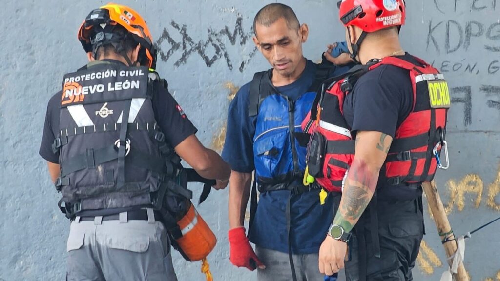 Monterrey, N.L.- Elementos de Protección Civil de Nuevo León acudieron a un llamado de auxilio en el cruce de Morones Prieto y Garza Sada, en la colonia Nuevo Repueblo, donde dos hombres quedaron atrapados por la fuerte corriente debajo de un puente vehicular.