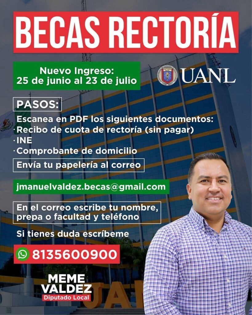 El Diputado, José Manuel Meme Valdez, continúa gestionando becas para la UANL, los alumnos de primer ingreso tienen hasta este próximo 23 de julio para solicitarla, por medio del correo que aparece en el flayer (o en la publicación)