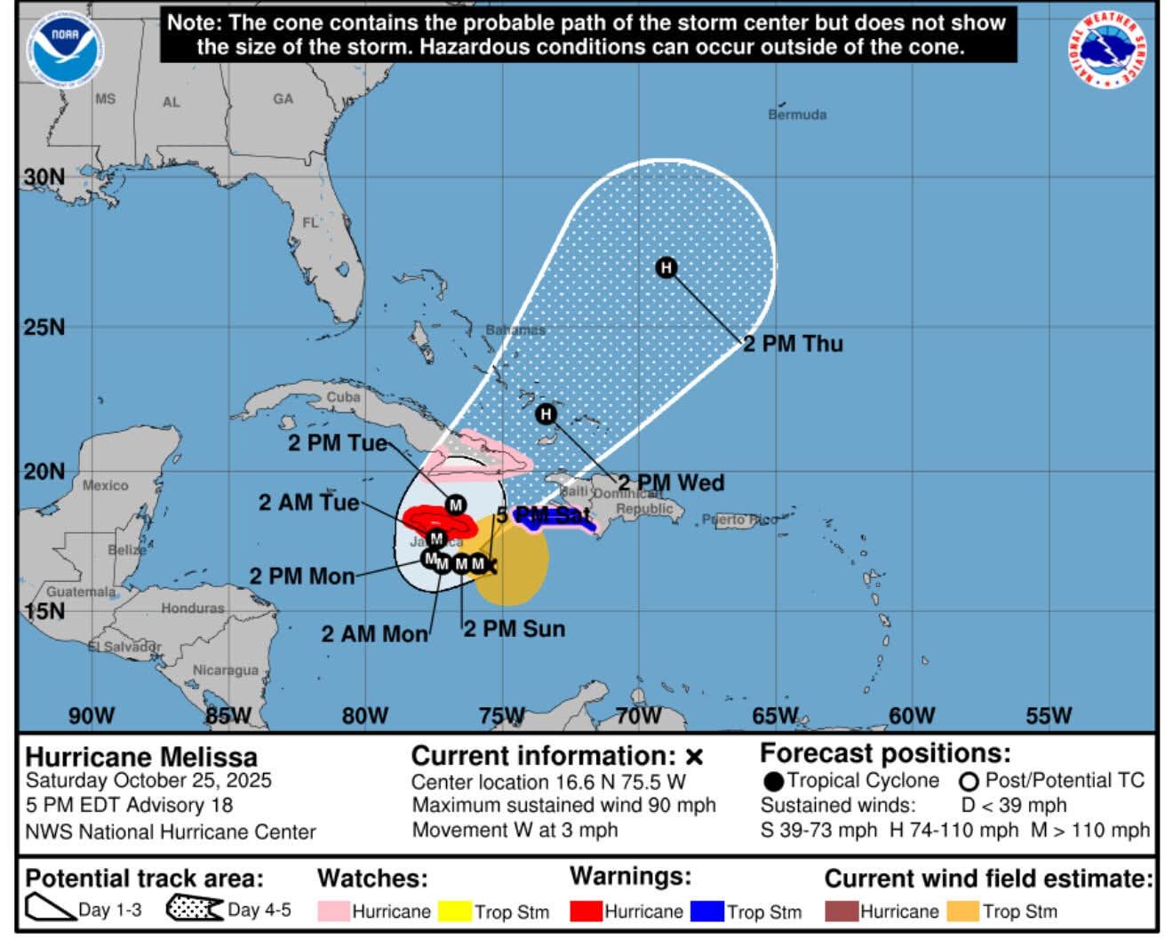 El poderoso huracán Melissa continúa fortaleciéndose mientras se dirige directamente a Jamaica, con vientos de hasta 295 km/h. Las autoridades han emitido alertas por lluvias intensas, marejadas y posibles inundaciones. Se recomienda extremar precauciones y seguir las indicaciones oficiales. 🇯🇲⚠️