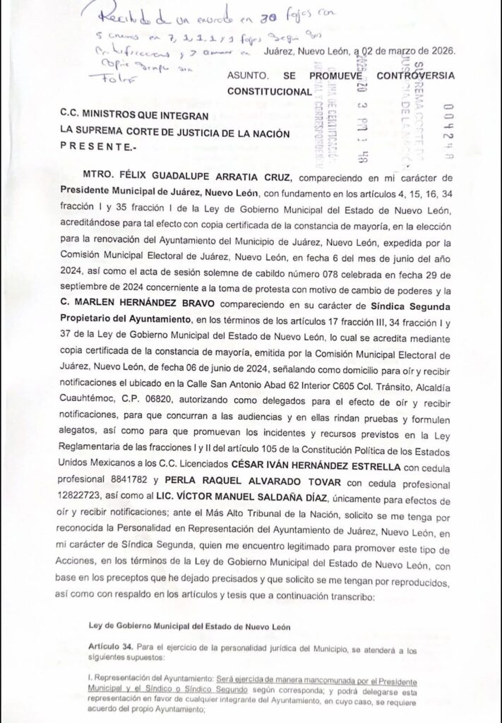 Juárez, Nuevo León — El alcalde de Juárez, Nuevo León, Félix Arratia Cruz, promovió una controversia constitucional ante la Suprema Corte de Justicia de la Nación para que se revise la legalidad de diversas multas y requerimientos emitidos por el Instituto Estatal de Transparencia, Acceso a la Información y Protección de Datos Personales de Nuevo León.