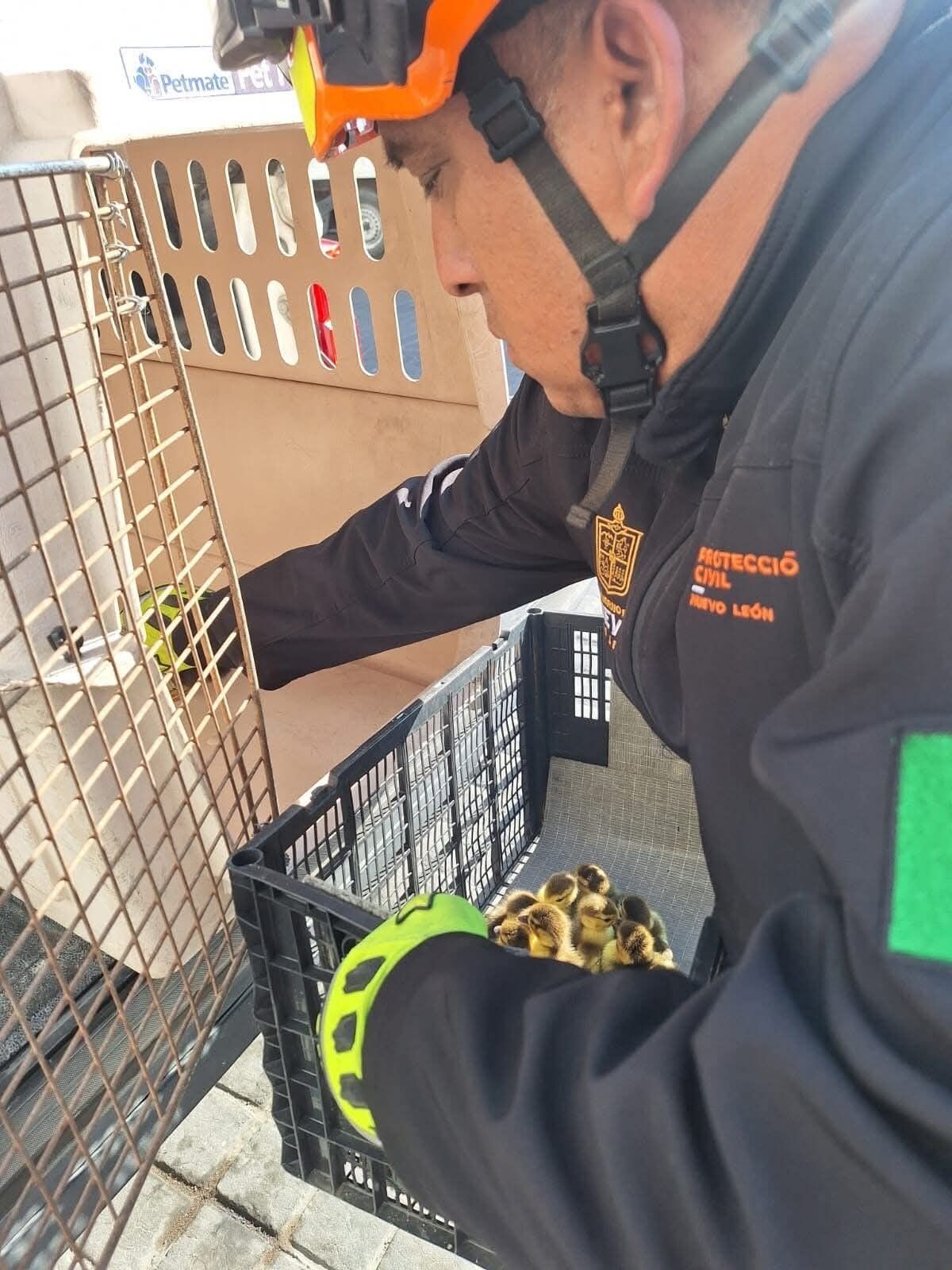 Elementos de Protección Civil de Nuevo León acudieron al sitio para resguardar a 14 patitos que se encontraban junto a su madre, evitando riesgos ante el tránsito vehicular y la presencia de peatones en la zona.
